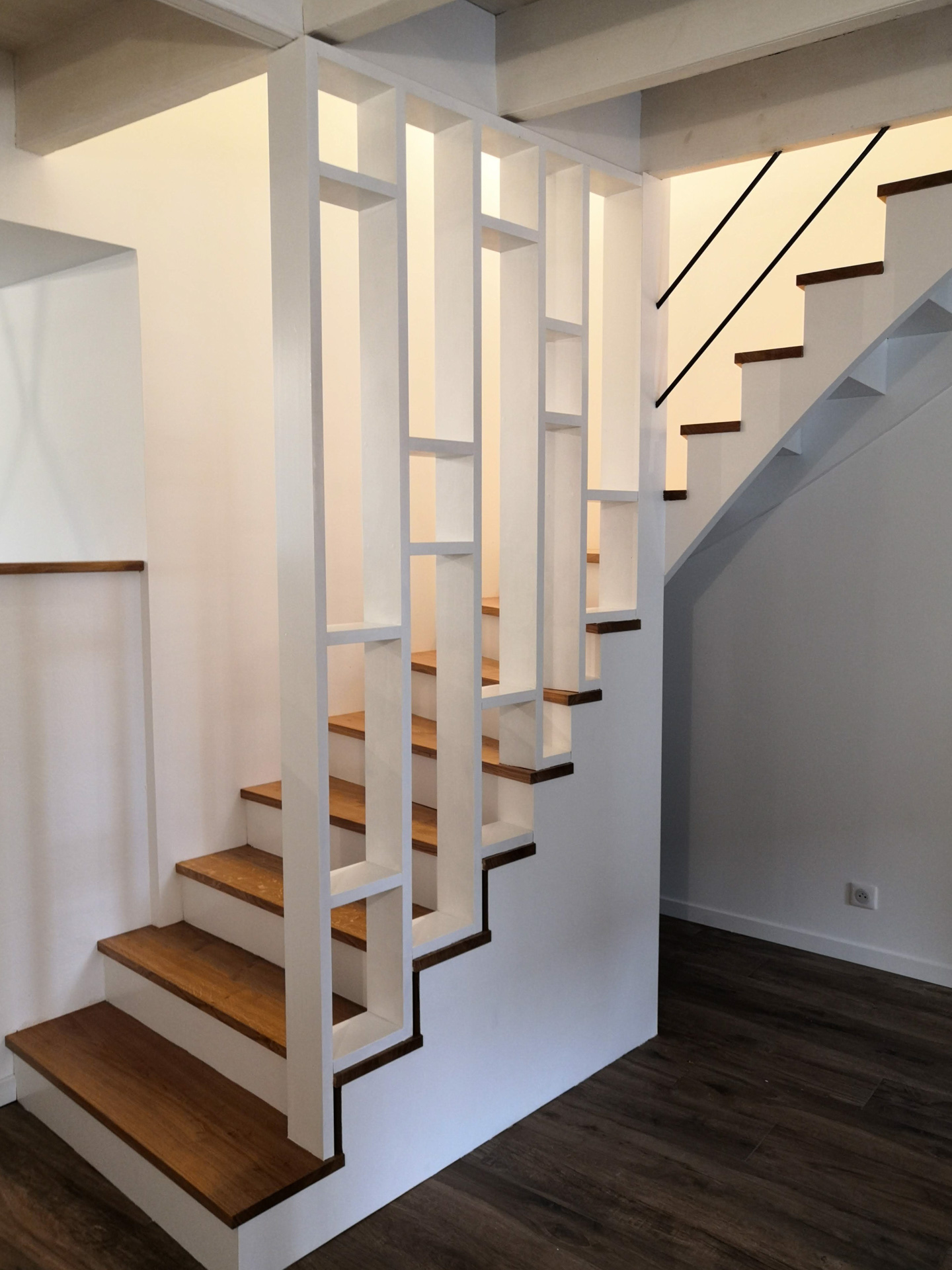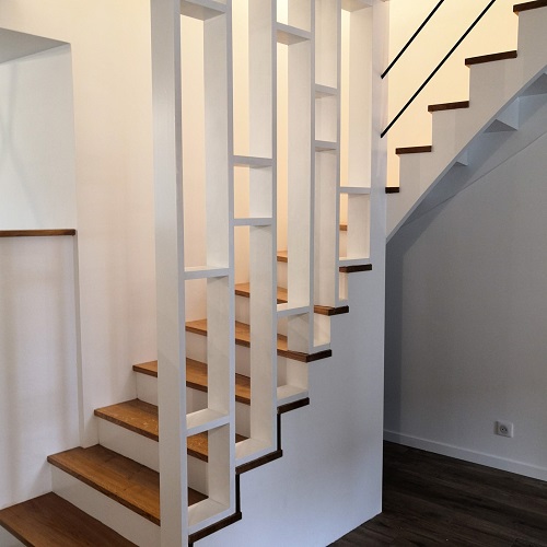 - Le métal ou le verre peuvent s’associer sans problème au remplissage des échiffres et garde-corps.